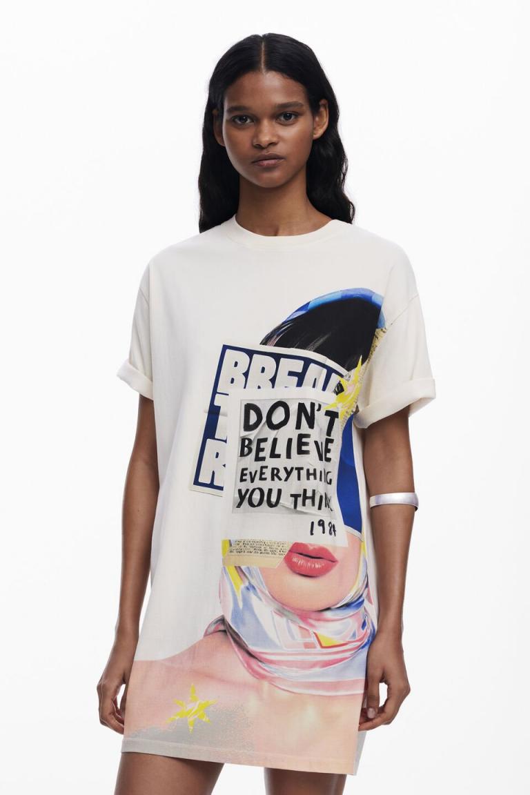 Vestido corto tipo camiseta de manga corta con estampado de cara femenina y serigrafía Fit: Loose Largo: Corto Cuello: redondo Manga: Corta Al comprar productos de algodón de Desigual, estás apoyando nuestra inversión en Better Cotton. Este producto se obtiene a través de un sistema de balance de masas y puede que no contenga Better Cotton. bettercotton.org/massbalance Medidas de la modelo:Altura: 178 cm; Cintura: 54 cm; Cadera: 86 cm Talla de modelo:XS SKU: 25SWVK206008